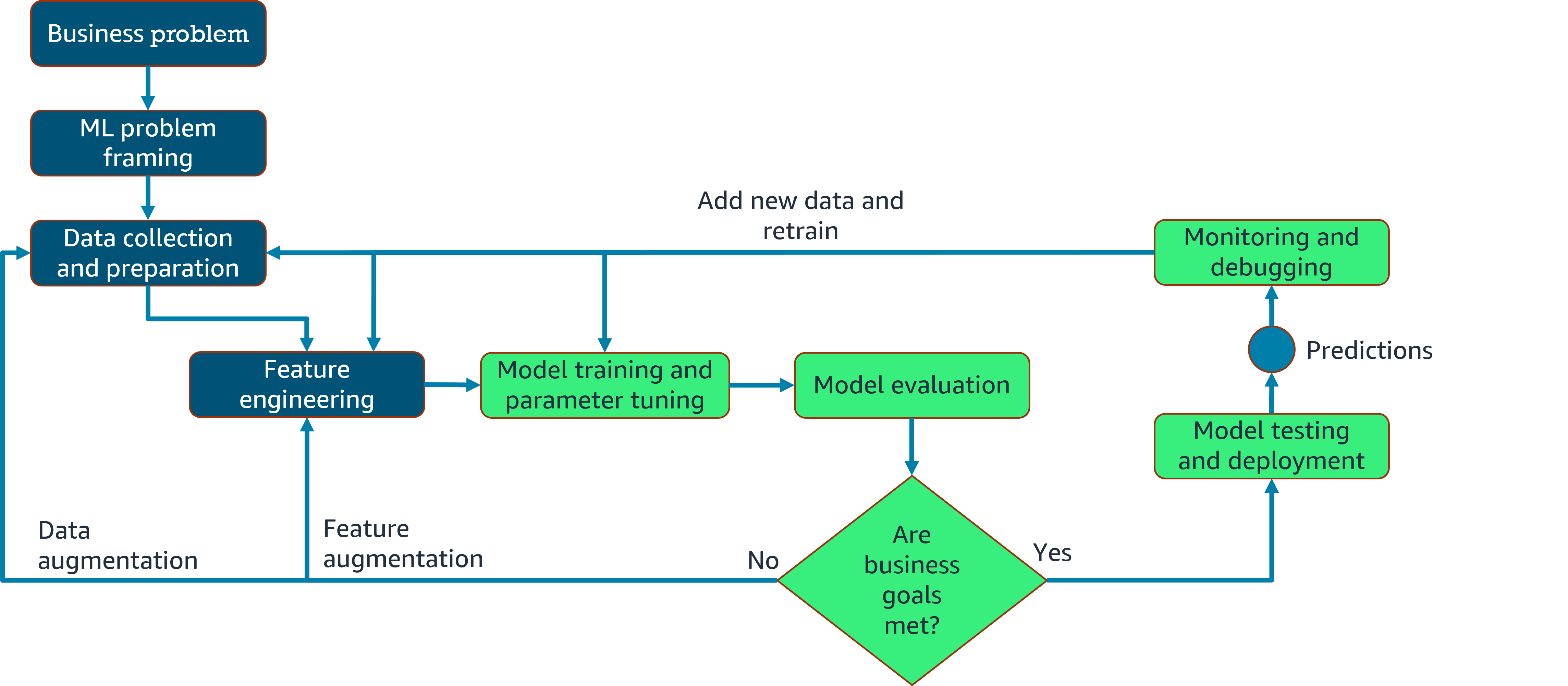 Initially, upon training, the model will not yield the expected results. Therefore, developers will do additional feature engineering and tune the model's hyper-parameters before retraining.