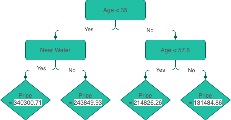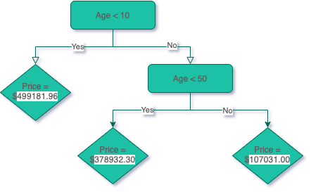 Using the data above, we can create the regression tree, as shown below. The prices were determined by calculating the average price of the houses in the age range.
