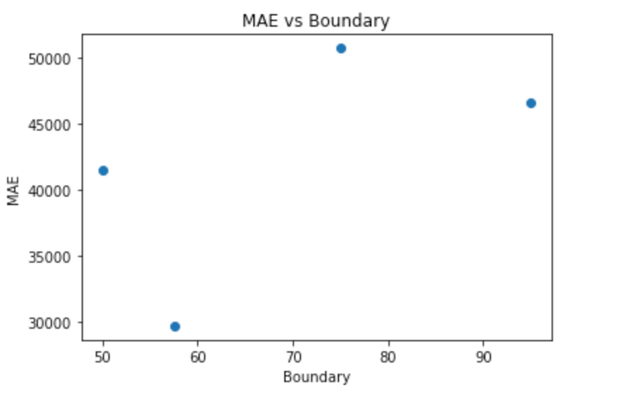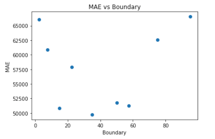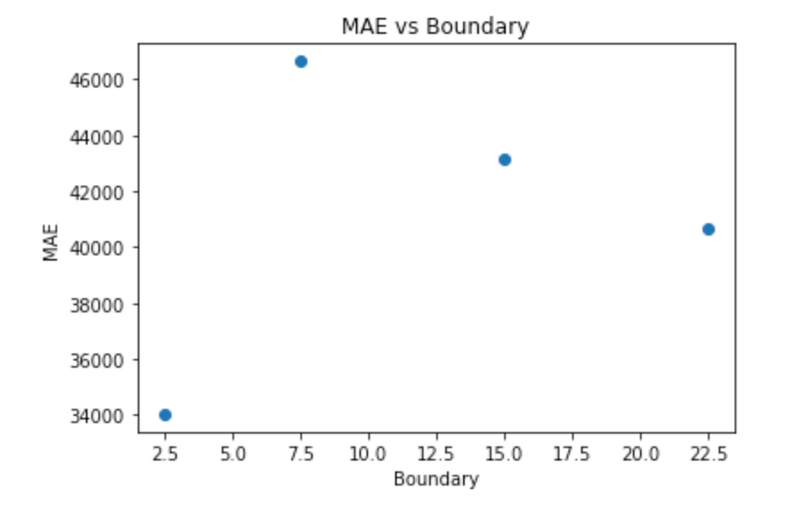 For example, first we create the boundary between the first two data points, which are (0, 260831.34) and (5, 347982.98), so we create a boundary of x = 2.5 (The midpoint between the x component of the first two data points). We now find the average price of the houses on the left and right sides of this boundary and use it to calculate the MAE.